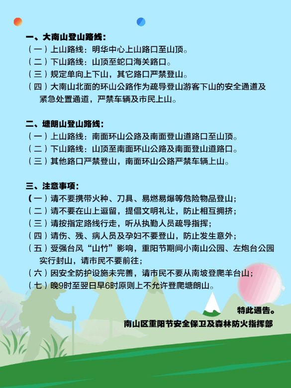 南山區(qū)重陽節(jié)登山通告出爐!小南山左炮臺重陽封山(附登山路線示意圖)