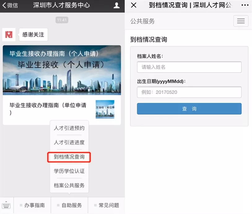 關注“深圳市人才服務中心”公眾號查詢到檔情況,辦理檔案相關業(yè)務。
