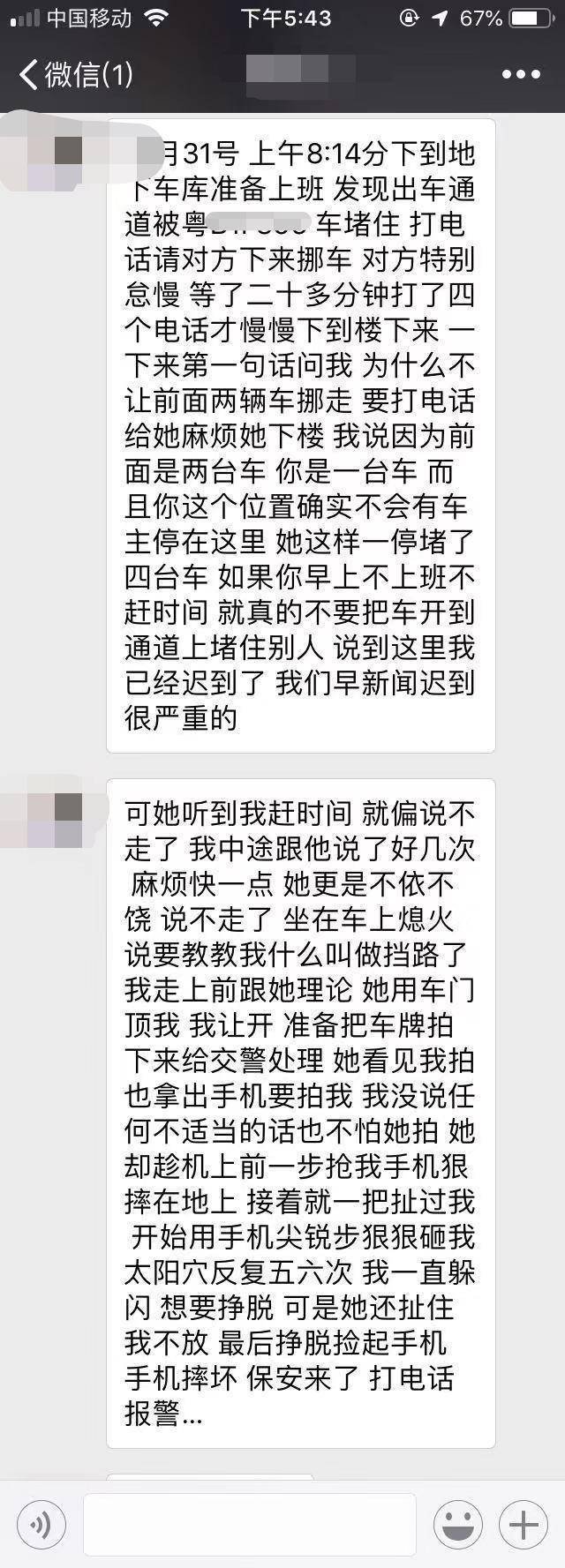 李小姐說(shuō),當(dāng)天早上8點(diǎn)14分,她下到車庫(kù)準(zhǔn)備開車上班,發(fā)現(xiàn)出車通道被一輛黑色小車阻擋。她便打電話請(qǐng)車主下樓挪車。她表示,自己在電視臺(tái)工作,因著急趕著錄制早新聞,打了四個(gè)電話給對(duì)方車主,等待了近20分鐘,車主才下到車庫(kù)。