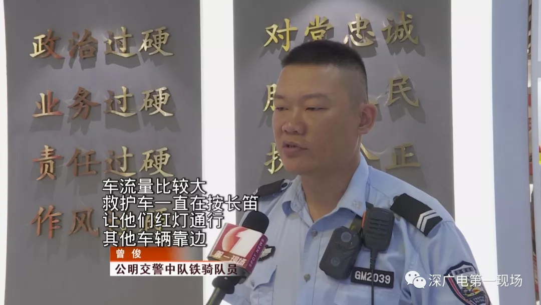 在場的四名鐵騎隊員立即進行分工,在救護車被堵的紅綠燈口,其中一名鐵騎,曾俊首先對救護車前方等待紅燈的車輛進行疏導。
