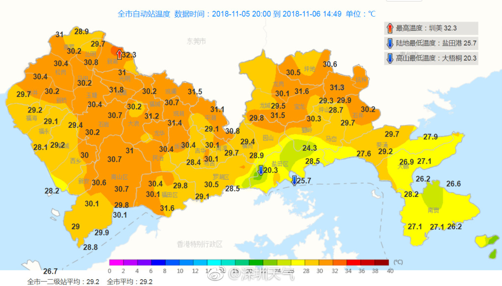 深圳氣象局于11月5日20時發(fā)布全市自動站溫度