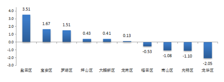 從各區(qū)(新區(qū))城市交通文明進(jìn)步指數(shù)來看,福田區(qū)、羅湖區(qū)、鹽田區(qū)、寶安區(qū)、坪山區(qū)和大鵬新區(qū)均有所進(jìn)步,其中寶安區(qū)進(jìn)步最大,進(jìn)步指數(shù)為2.08%,鹽田區(qū)次之,進(jìn)步指數(shù)為1.72%;而南山區(qū)、龍崗區(qū)、光明區(qū)和龍華區(qū)則有所退步,其中龍華區(qū)和龍崗區(qū)退步較大,進(jìn)步指數(shù)分別為-1.53%和-1.22%(見圖4)。