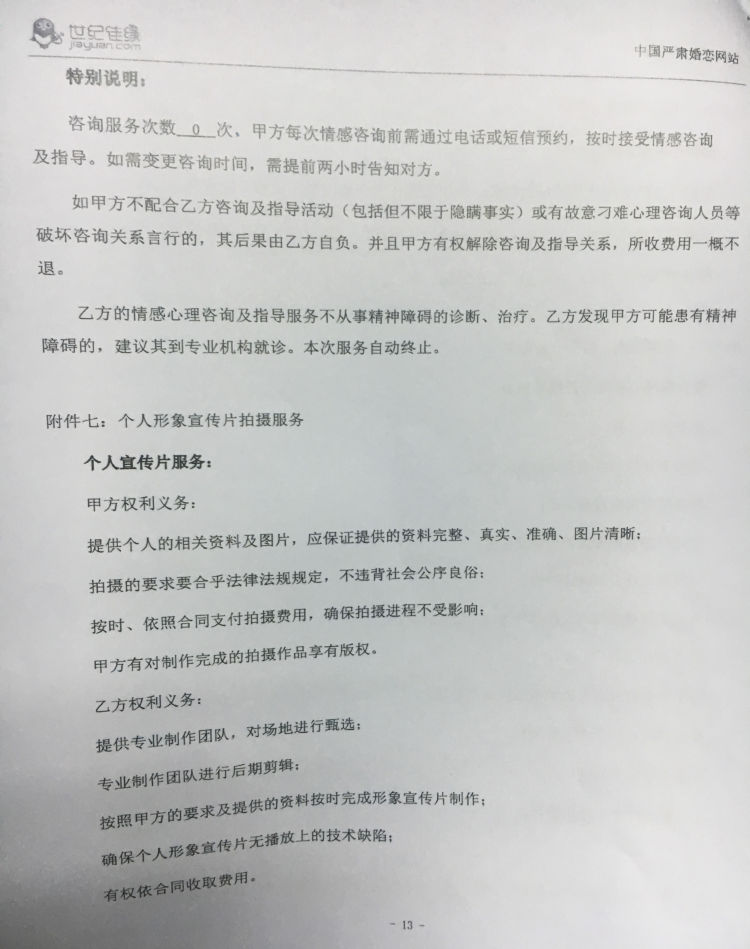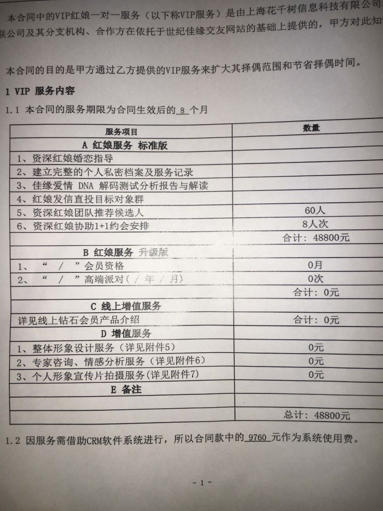 今年2月27日,劉小姐與世紀(jì)佳緣簽訂了一份繳款4.88萬(wàn)的紅娘服務(wù)合同。合同服務(wù)期限為8個(gè)月,合同將根據(jù)其擇偶標(biāo)準(zhǔn),由系統(tǒng)推薦60位候選人,其中紅娘協(xié)助線(xiàn)下約會(huì)安排8人次。此外,合同還包含三項(xiàng)增值服務(wù),包括整體形象設(shè)計(jì),專(zhuān)家咨詢(xún)、情感分析服務(wù)和個(gè)人宣傳片服務(wù)。