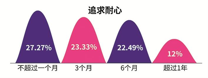 在追求耐心方面,有超七成單身男女追求愛(ài)情的時(shí)間不超過(guò)半年,其中27.27%的單身表示對(duì)喜歡的人追求時(shí)間不超過(guò)一個(gè)月,23.33%的人追求時(shí)間為3個(gè)月,另外有22.49%愿意追求時(shí)間為6個(gè)月,僅有12%的單身男女追求喜歡的人愿意超過(guò)1年。
