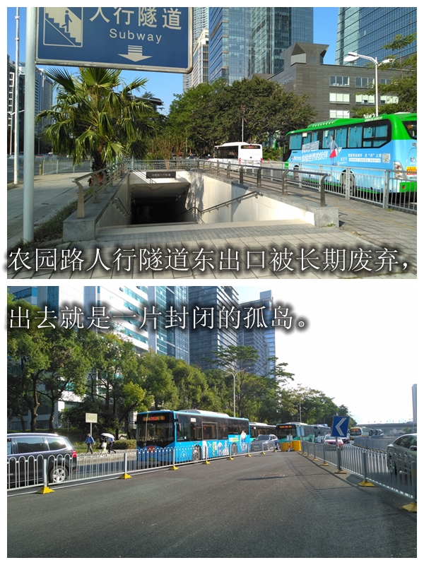 自2017年連通深南大道兩側(cè),可供行人通行的人行天橋被拆卸后,行人都只能從人行隧道過街。但奇怪的是,人行隧道的東出口處是一片被隔離、被荒廢的“孤島”,這讓需要從此出口通行的市民很尷尬。即使避開這個出口,選擇繞行,又容易在農(nóng)園路口與右轉(zhuǎn)車輛發(fā)生沖突。“真的很為難我們啊。”市民吳先生證實了步行通過該路段的“艱難”。