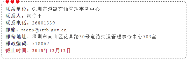 根據(jù)《深圳市機(jī)動(dòng)車道路臨時(shí)停放管理辦法》相關(guān)規(guī)定,市交委現(xiàn)就以上18條道路路邊停車泊位設(shè)置方案公開征求意見。市民如有意見和建議,可于2018年12月12日前反饋給市交委。郵寄地址為深圳市南山區(qū)花果路30號道路交通管理事務(wù)中心503室。