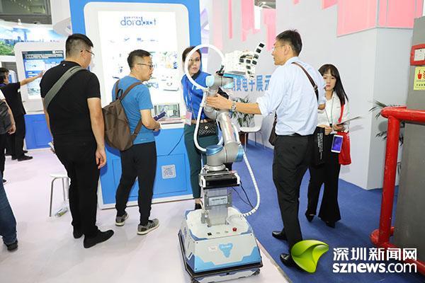 陳軍一行首先來到藍(lán)胖子機(jī)器人的展臺(tái),該展臺(tái)的一個(gè)機(jī)器人大手臂引人注目?!斑@個(gè)是我們自主研發(fā)的移動(dòng)機(jī)械臂,是下一代知能物流機(jī)器人,以后物流倉庫都可以讓機(jī)器人來替代人工。”藍(lán)胖子機(jī)器人展臺(tái)負(fù)責(zé)人介紹,這個(gè)移動(dòng)機(jī)械臂可以用于倉庫、集裝箱、貨車車廂、機(jī)場、海港等場景,提升裝卸載、分揀、運(yùn)輸?shù)拳h(huán)節(jié)。來提升效率,降低成本,應(yīng)對(duì)全球物流行業(yè)的巨大增量。