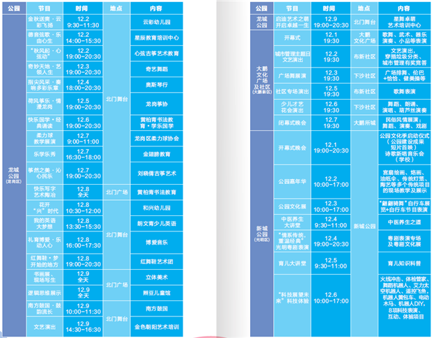 本次公園文化季由往年的公園文化節(jié)演變而來(lái),時(shí)間由原先的一周延長(zhǎng)為一個(gè)月。11月16日至12月16日,市、區(qū)各公園共設(shè)22個(gè)會(huì)場(chǎng),組織180多項(xiàng)文藝節(jié)目在公園展演,免費(fèi)讓廣大市民欣賞。