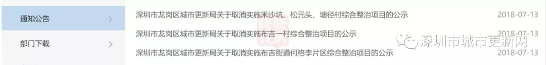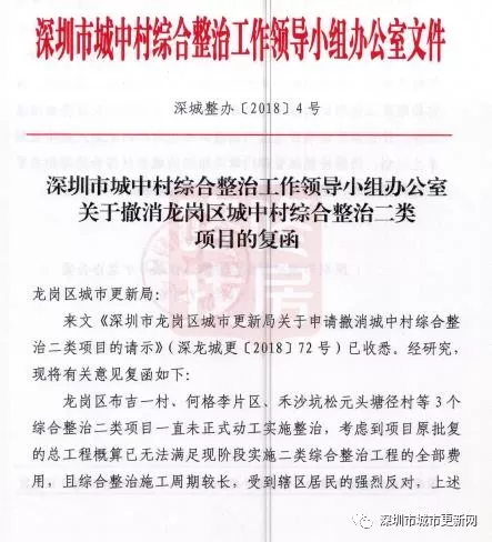 事實上,早在2018年7月,龍崗區(qū)城市更新局就已經(jīng)依據(jù)相關(guān)規(guī)定要求,批復(fù)取消這幾個城中村實施綜合整治的申請,并予以公示。此次的批復(fù)公告實際為區(qū)城市更新局向上級城中村綜合整治領(lǐng)導(dǎo)和決策機(jī)構(gòu)(深城整辦)的請示文件所反饋的意見復(fù)函。
