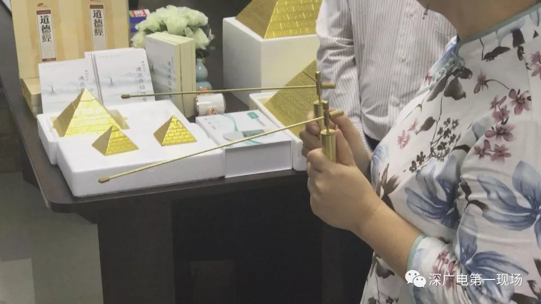 一開始,就上來了一位叫許姐的團(tuán)隊(duì)負(fù)責(zé)人,但她并沒有著急介紹主角“萬能金字塔”,而是不慌不忙地賣弄起另一樣所謂的“神器”——尋龍尺。