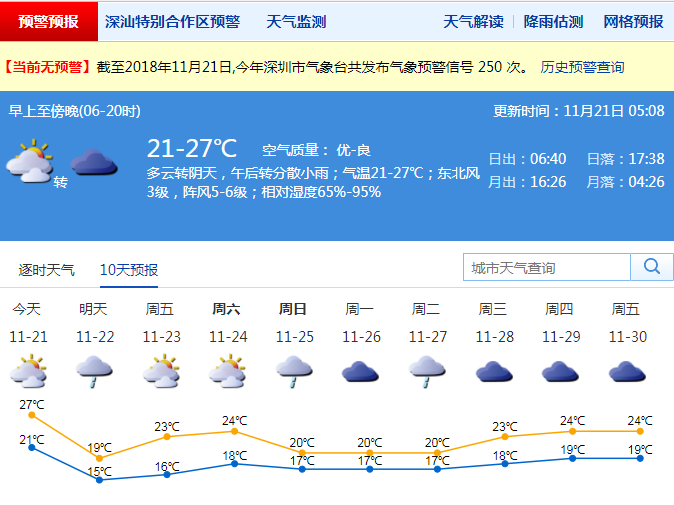 市氣象局預(yù)計(jì),20日17-20時(shí),深圳市以多云天氣為主;氣溫在22-25℃;相對濕度65%-85%;偏北風(fēng)3-4級,陣風(fēng)5-6級;全市能見度大部分地區(qū)在10公里以上。傍晚天氣舒適,適合戶外運(yùn)動(dòng)。21日夜間至22日冷空氣影響,有小雨,北風(fēng)加大,沿海和高地最大陣風(fēng)7-8級,22日最低氣溫會(huì)降至15℃左右;23-24日晴天間多云,氣溫回升;25-26日,陰天有陣雨。