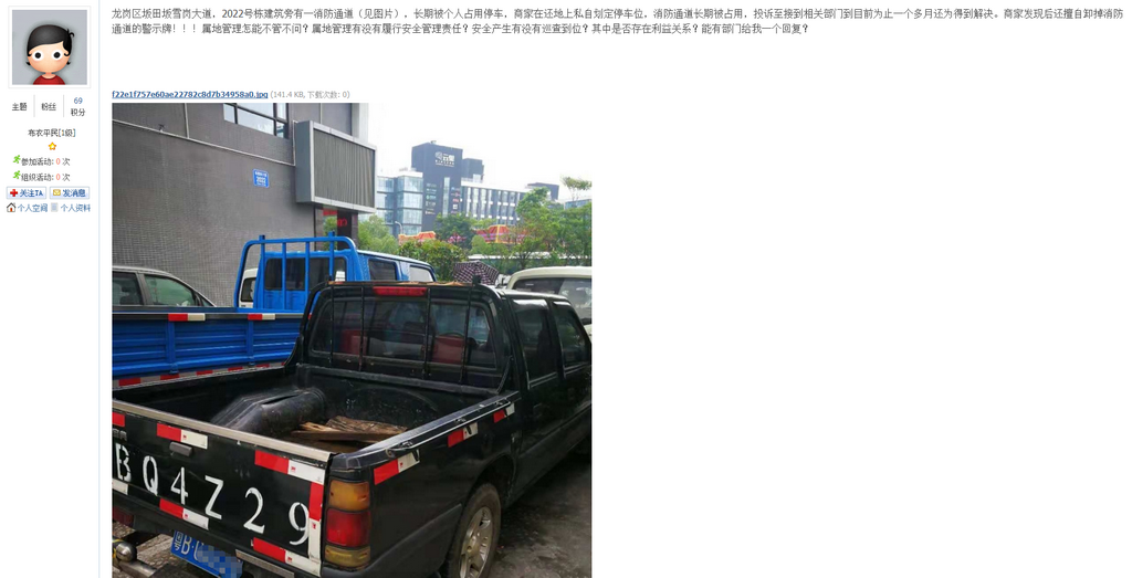 深圳新聞網(wǎng)11月22日訊(記者劉婷)隨著私家車(chē)數(shù)量的增多,停車(chē)越來(lái)越難,而亂停車(chē)的現(xiàn)象也日益增多。近日,有網(wǎng)友“hepingshijie”在深圳論壇發(fā)帖吐槽,坂田坂雪崗大道2022號(hào)棟建筑旁一消防通道,長(zhǎng)期被私家車(chē)占用,存在嚴(yán)重的安全隱患。(網(wǎng)帖地址:https://szbbs.sznews.com/thread-3823312-1-1.html)