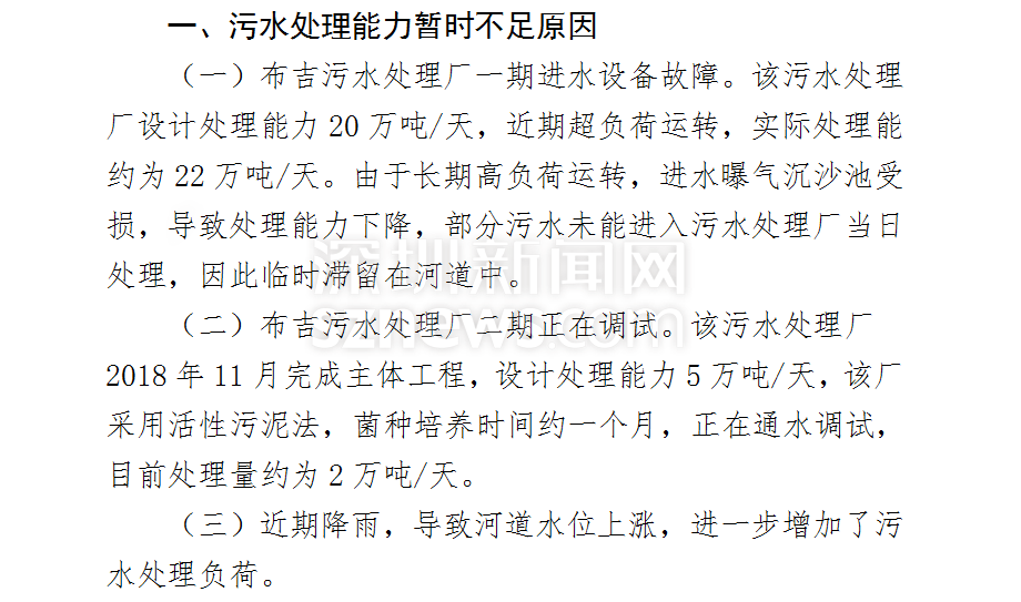 在其復函中,明確說明了河道黑臭的原因主要為該片區(qū)污水處理能力暫時不足(片區(qū)污水產(chǎn)生量約為26萬噸/天,目前實際污水處理量約為24萬噸/天),為防止生活污水直排下游,臨時設(shè)置橡膠壩,生活污水臨時滯留河道所致。