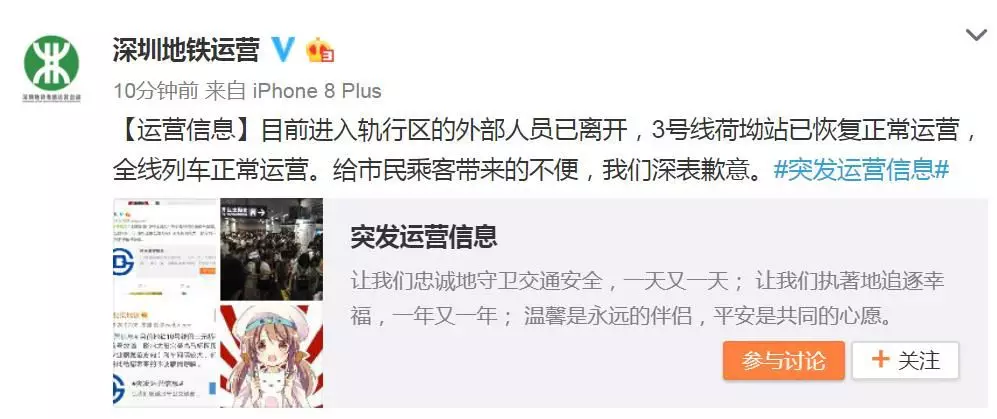 而據(jù)@深圳地鐵運(yùn)營19點(diǎn)44分消息稱,3號(hào)線荷坳站已恢復(fù)正常運(yùn)營,全線列車正常運(yùn)營。