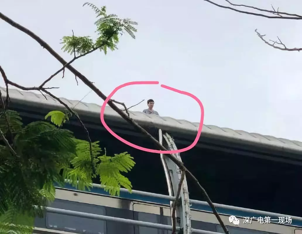 發(fā)現(xiàn)男子的進(jìn)入軌行區(qū)后,地鐵工作人員馬上聯(lián)系警方,隨后警方和消防人員也趕到現(xiàn)場(chǎng),這時(shí)這名男子已經(jīng)坐在了荷坳站的頂棚上。