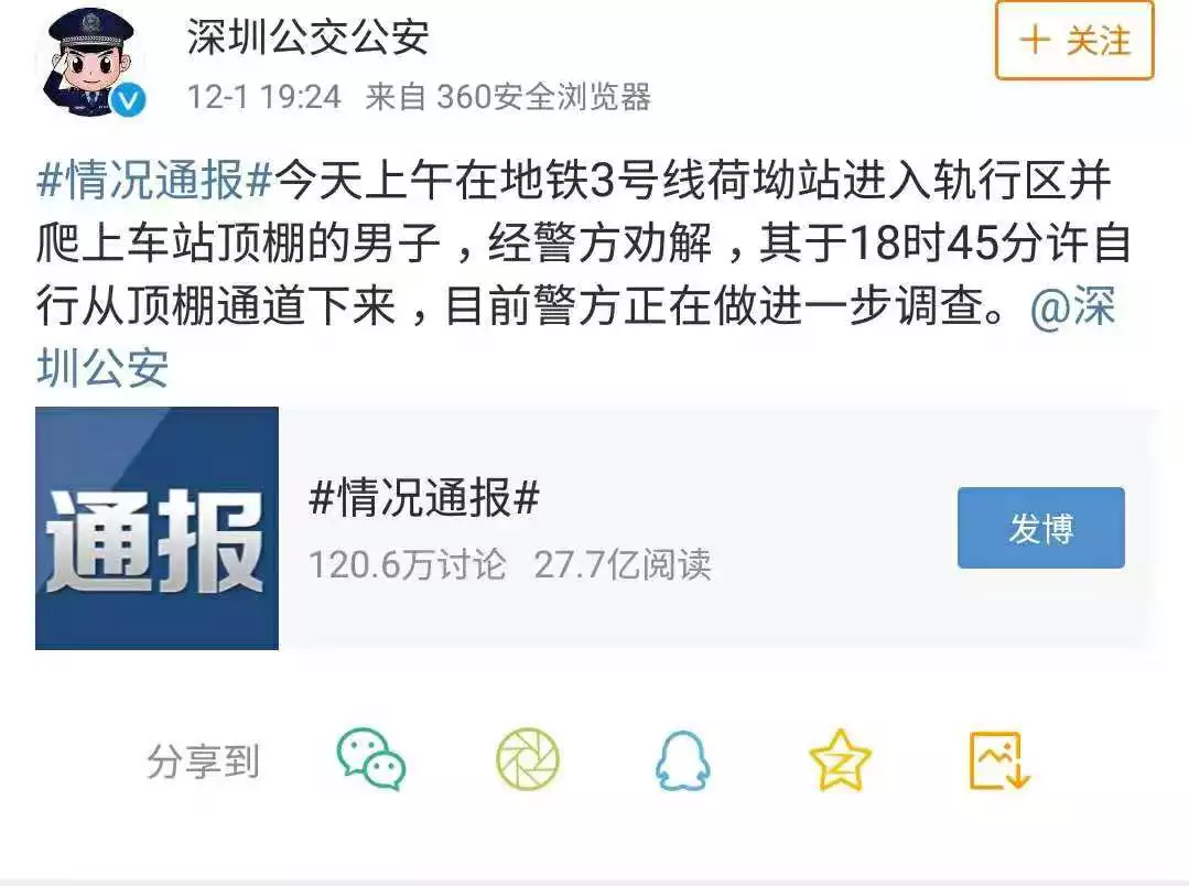 昨晚(12月1日)18點(diǎn)45分左右,爬上深圳地鐵3號(hào)線荷坳站頂棚的男子被成功勸下來。該男子早上8點(diǎn)多翻越屏蔽門爬上站頂,導(dǎo)致地鐵3號(hào)線部分運(yùn)行區(qū)間延誤,荷坳站暫停運(yùn)營。