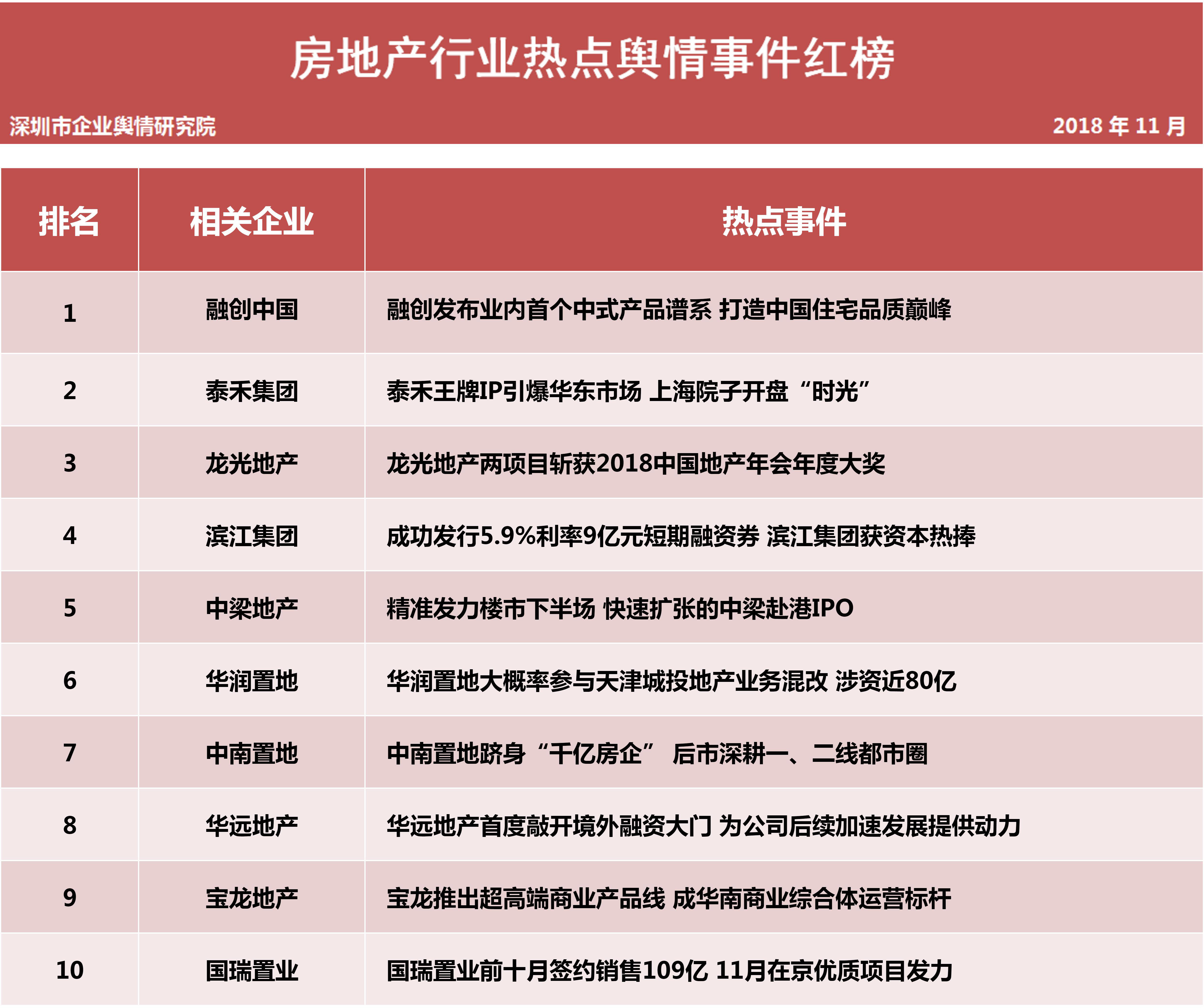 深圳新聞網(wǎng)訊 (記者田志強(qiáng) 通訊員陳文光)12月5日,深圳企業(yè)輿情研究院發(fā)布第十批企業(yè)輿情榜單。本次榜單重點(diǎn)聚焦房地產(chǎn)及醫(yī)藥保健兩個(gè)行業(yè)。房地產(chǎn)行業(yè)企業(yè)輿情榜單由房地產(chǎn)行業(yè)熱點(diǎn)輿情事件排行榜(紅、黑榜)及房地產(chǎn)企業(yè)公眾形象排行榜組成。