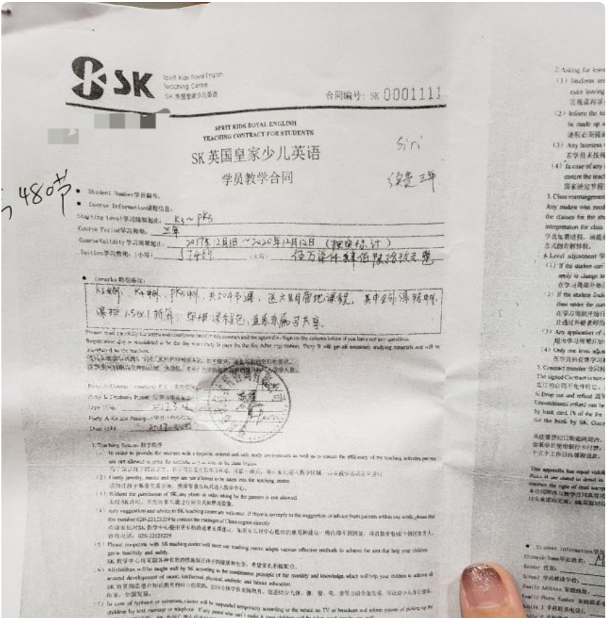 12月2日,家住福田區(qū)的徐先生照常把孩子帶到香蜜湖1979文化創(chuàng)意園的"SK英國皇家少兒英語"上課,沒想到到了課堂卻收到一紙停課通知。工作人員告訴徐先生,由于經(jīng)營不善,機構老板決定停止授課,家長們要提供當初簽訂的合同和收據(jù)辦理退款,但是在2018年3月1日前交學費的家長不能退款。