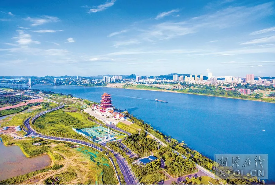藍(lán)天白天映襯下的湘江湘潭段,江水清澈。(記者 方陽 攝)