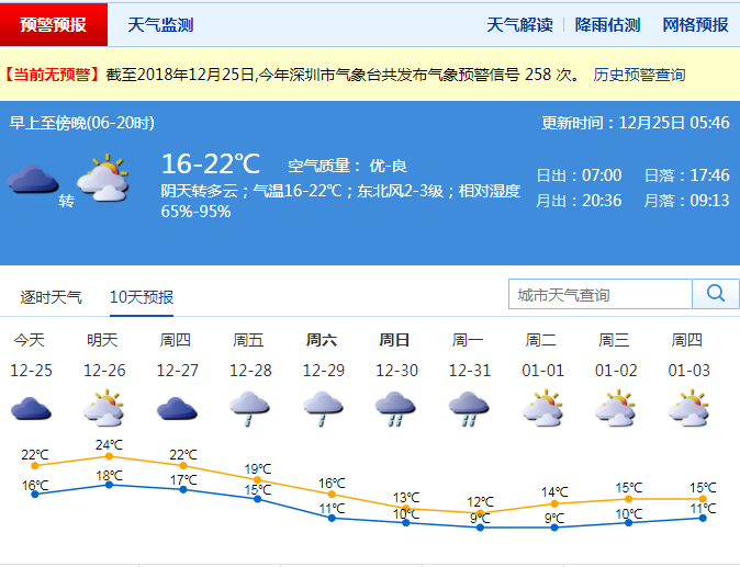 深圳新聞網(wǎng)2018年12月25日訊 連日來,受弱冷空氣南下活動影響,與前期上空的暖濕氣流相遇,導(dǎo)致鵬城陰天并伴有小雨天氣,氣溫下降3℃-4℃。24日早晨最低氣溫普遍在14℃,天氣陰涼。市氣象臺預(yù)測,未來三天轉(zhuǎn)多云天氣,氣溫回升,最高氣溫可達(dá)24℃。