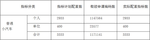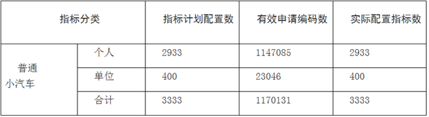 據(jù)悉,2018年第11期以搖號(hào)方式配置的普通小汽車增量指標(biāo)共3333個(gè),其中個(gè)人2933個(gè)、單位400個(gè)。參加搖號(hào)的有效編碼數(shù)共1171141個(gè),其中個(gè)人普通小汽車有效編碼1147564個(gè),單位普通小汽車有效編碼23577個(gè)。
