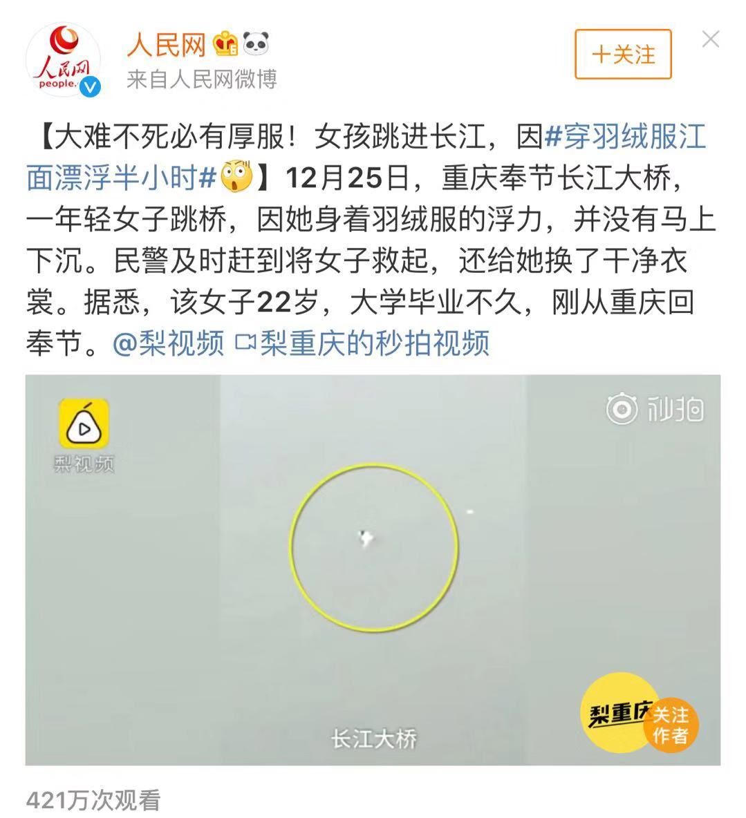 重慶有個22歲的姑娘跳長江尋短見,因身上羽絨服的浮力在江上漂浮了近半小時