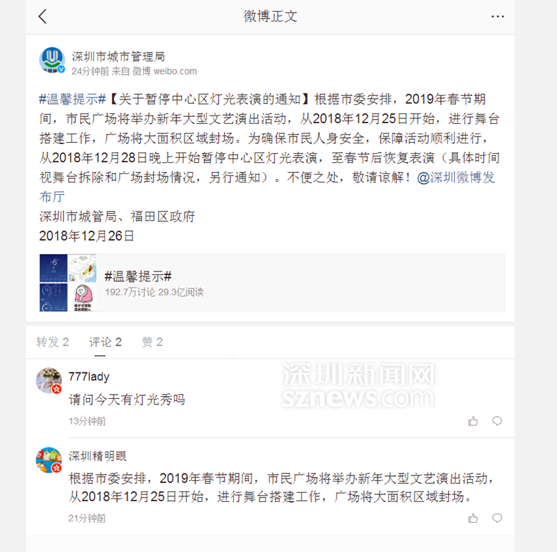 深圳燈光秀12月28日起暫停表演 春節(jié)后再恢復