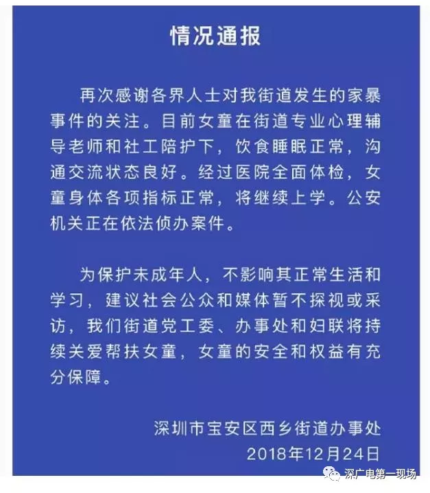 12月24日晚,深圳市寶安區(qū)西鄉(xiāng)街道辦通報(bào)表示:目前女童在街道專業(yè)心理輔導(dǎo)老師和社工陪護(hù)下,飲食睡眠正常,溝通交流狀態(tài)良好。經(jīng)過(guò)醫(yī)院全面體檢,女童身體各項(xiàng)指標(biāo)正常,將繼續(xù)上學(xué)。