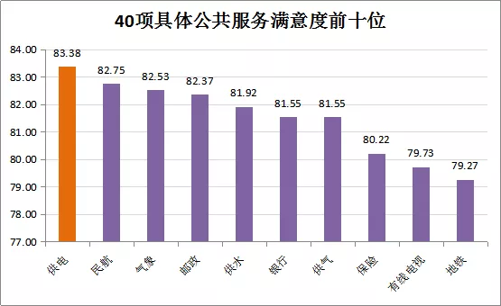 在40項(xiàng)具體公共服務(wù)中,公眾對(duì)供電服務(wù)的滿意度依然最高,得分為83.38分,連續(xù)十年位居全省40項(xiàng)政府公共服務(wù)第一位,廣州、深圳、中山等21個(gè)地市供電服務(wù)的滿意度也均位列各市公共服務(wù)首位??諝馕廴局卫恚?0.16分)、垃圾回收與處理(69.37分)、水環(huán)境治理(68.46分)、污水處理(68.42分)、噪聲控制效果(67.43分)的滿意度較低。
