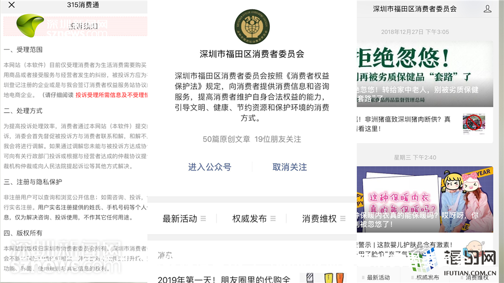 福田區(qū)消委會微信公眾號界面,包含消費維權投訴、發(fā)布消費警示等內容。