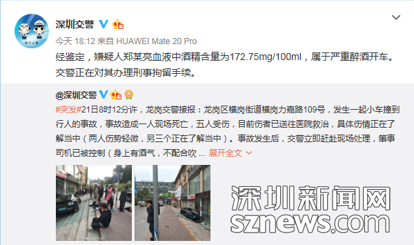 據(jù)深圳交警官方微博通報,目前傷者已送往醫(yī)院救治,具體傷情正在了解當(dāng)中(兩人傷勢輕微,另三個正在了解當(dāng)中)。肇事司機已被控制,其身上有酒氣,不配合吹氣,正抽血,初步懷疑酒后駕駛是造成此事故的原因。