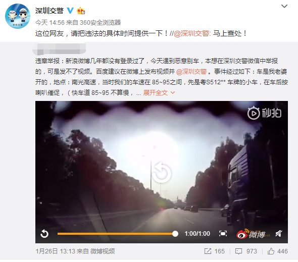 1月28日下午5點(diǎn),深圳交警在微博上也給網(wǎng)友作出回復(fù),對于長時(shí)間龜速占用超車道的行為也將一并調(diào)查。