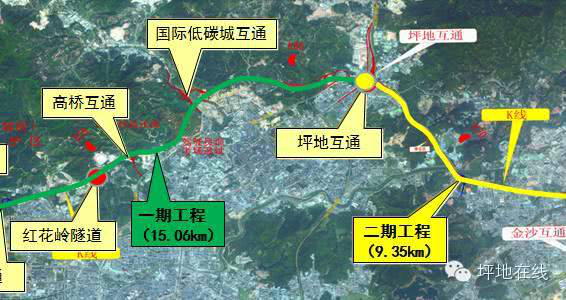 路線長約15.06公里,全線雙向六車道,并在坪地設坪地高橋、深圳國際低碳城、龍崗大道三個高速出入口。