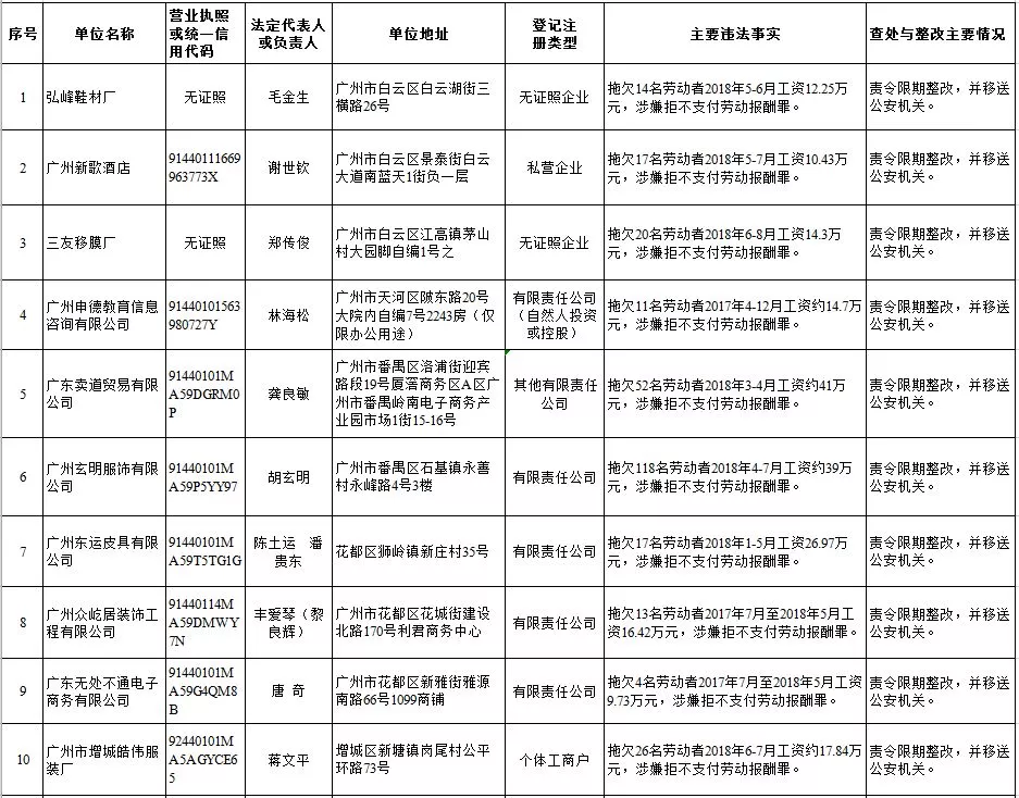 深圳新聞網(wǎng)2019年1月29日訊 (記者 劉婷)據(jù)廣東發(fā)布消息,省人社廳近日公布,2019年第一批用人單位重大勞動(dòng)保障違法行為名單。到底是哪些企業(yè)在惡意欠薪?這些“老賴”企業(yè)的營業(yè)執(zhí)照、地址、法人等等超全信息都在這!