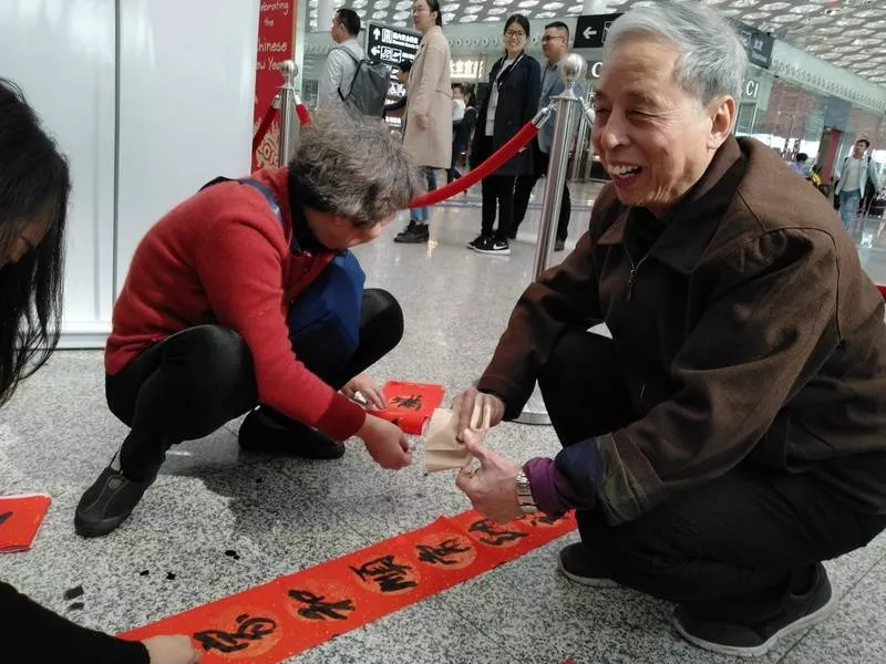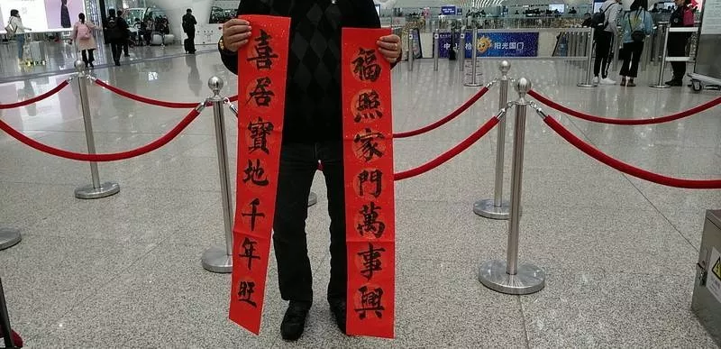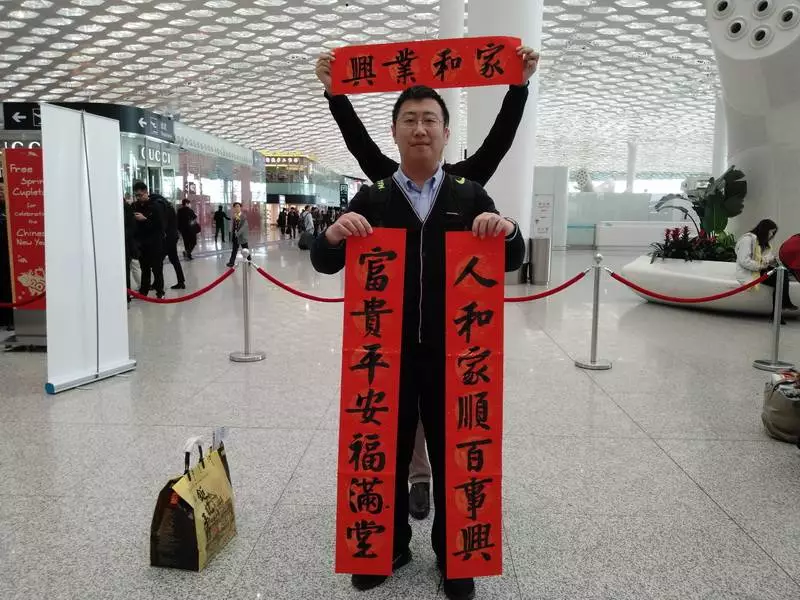 來領(lǐng)春聯(lián)的旅客里有國內(nèi)輾轉(zhuǎn)回老家的,有回國過年的,也有特地去國外過年的。來自江西婺源的曾老先生11點(diǎn)多的飛機(jī)飛往馬來西亞,今年他和老伴、孩子將在馬來西亞過年。他選的這兩幅春聯(lián)是他對新年的希望與祝福,將帶到馬來西亞貼起來,給新年增添年味兒。“我還可以送給朋友,這是最好的禮物,他們一定會喜歡的?!痹壬吲d地說。