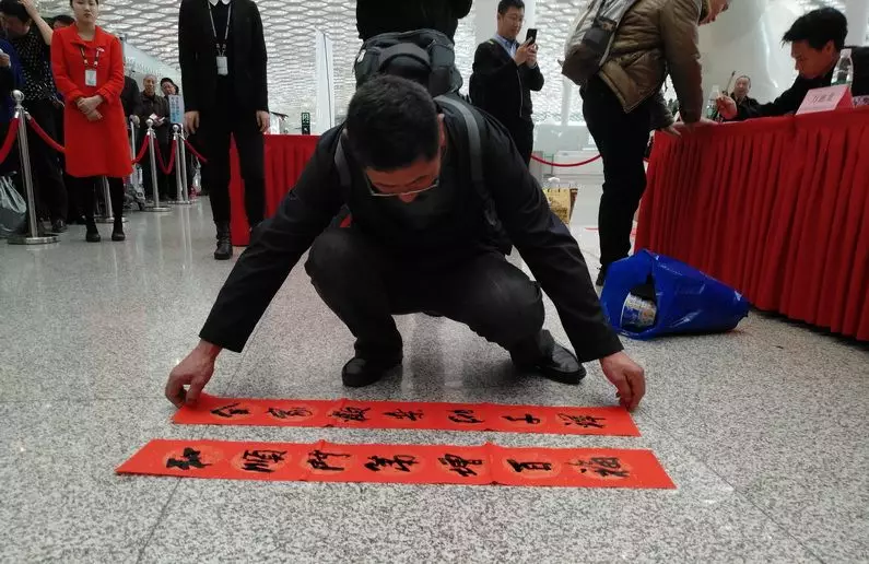 ▲越來越多的旅客來到送春聯(lián)活動(dòng)現(xiàn)場,選好自己心儀的話語,由書法家們揮毫寫下。