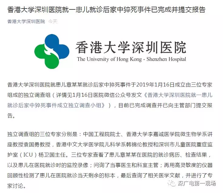 1月31日,香港大學深圳醫(yī)院再次發(fā)布消息,稱就患兒就診后家中猝死事件已完成調(diào)查并提交報告。全文如下: 香港大學深圳醫(yī)院就患兒章某某就診后家中猝死事件于2019年1月16日成立由三位專家組成的獨立調(diào)查組(詳情見1月16日醫(yī)院微信公眾號發(fā)文《香港大學深圳醫(yī)院就一患兒就診后家中猝死事件成立獨立調(diào)查小組》),目前已完成調(diào)查并已向主管部門提交報告。 獨立調(diào)查組的三位專家分別是:中國工程院院士、香港大學李嘉誠醫(yī)學院微生物學系講座教授袁國勇教授,香港中文大學醫(yī)學院兒科學系韓錦倫教授和深圳市兒童醫(yī)院重癥監(jiān)護室(ICU)楊衛(wèi)國主任。三位專家查看了患兒章某某在醫(yī)院的就診病歷、檢查結(jié)果,以及患兒在醫(yī)院就診時的監(jiān)控錄像;問詢了當事醫(yī)生和科室主管;再用高靈敏度的儀器回顧性檢測了患兒在醫(yī)院就診當天剩余的標本,最后查詢了相關(guān)醫(yī)學文獻,并進行了專家討論。 三位專家已出具了最終調(diào)查報告。報告確定了患兒感染的類型,分析了患兒猝死的原因很可能為心源性并發(fā)癥,并為今后避免類似事件再次發(fā)生提供了建議。報告指出醫(yī)院的診療過程符合專業(yè)規(guī)范。 2019年1月25日上午,醫(yī)院已將報告的內(nèi)容悉數(shù)告知患兒章某某家長,并對家長進行了慰問。同日,醫(yī)院也將報告上報給了主管部門。 由于報告的部分內(nèi)容涉及患兒及其家人隱私,以及報告的部分內(nèi)容依據(jù)《中華人民共和國傳染病防治法》規(guī)定,醫(yī)院沒有權(quán)限向公眾公開,所以醫(yī)院無法公布報告全文。 醫(yī)院一直秉持公開、專業(yè)、科學的方式處理這一個案,尋求真相,并依此對診療工作進行持續(xù)改進,促進醫(yī)學的進步。醫(yī)院也正在等待第三方的尸檢結(jié)果。 最后,醫(yī)院對獨立調(diào)查組的三位專家致以誠摯的謝意,感謝他們在短短數(shù)天時間內(nèi),認真、細致、嚴謹?shù)赝瓿闪苏{(diào)查,并撰寫了報告。 香港大學深圳醫(yī)院 2019年1月31日
