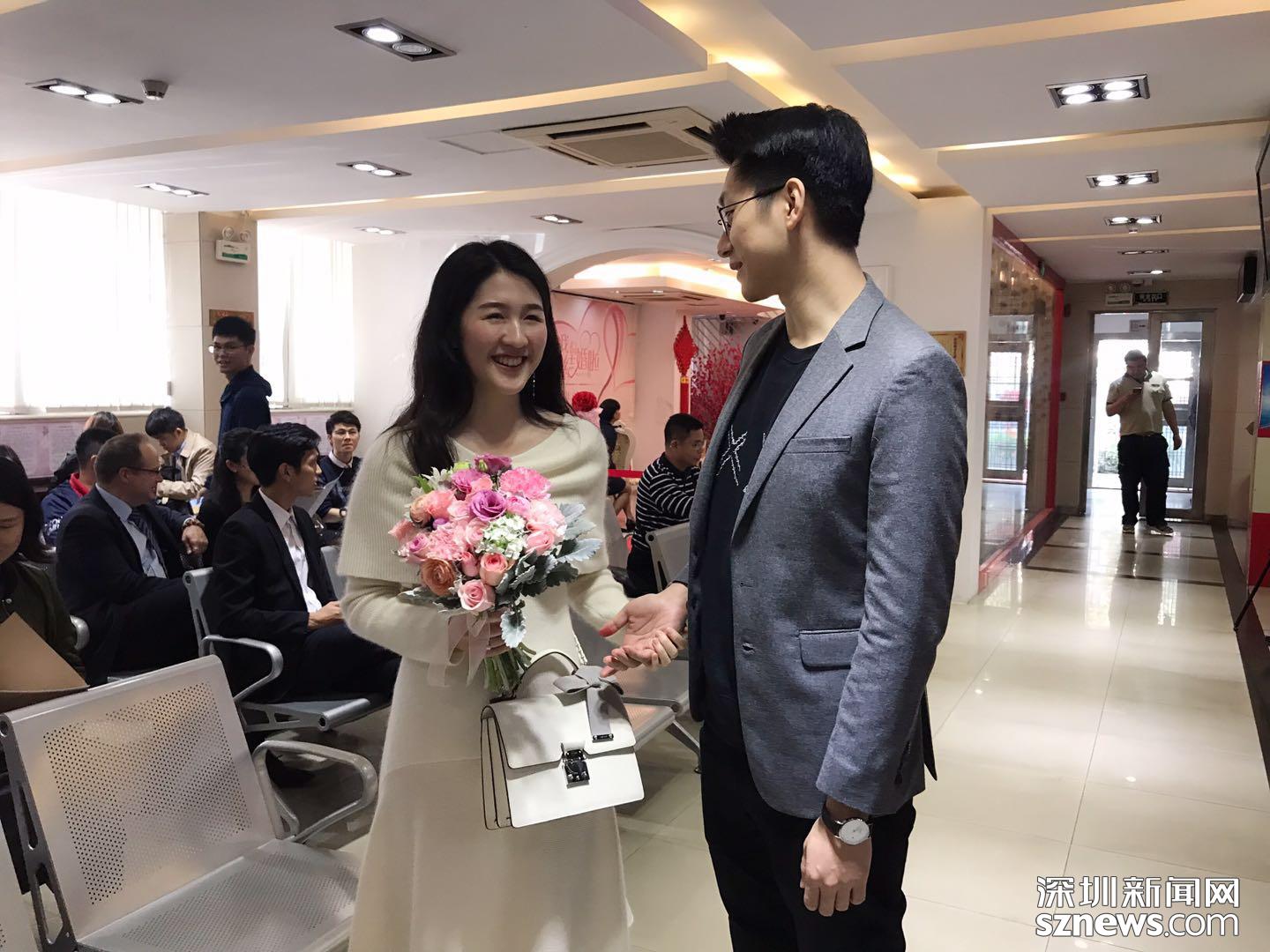 曾林雪和丈夫劉家勇在龍華區(qū)婚姻登記處拍照
