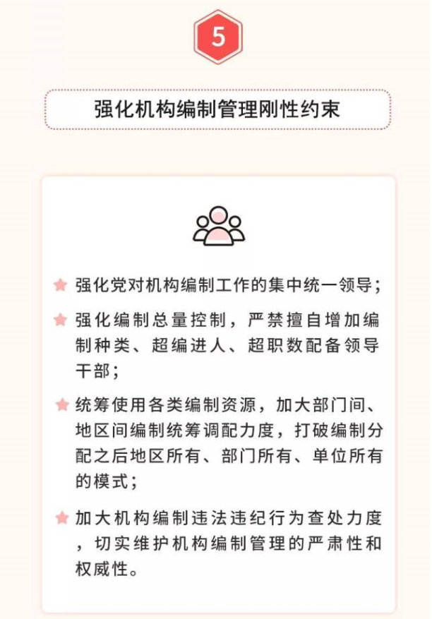 五是全面落實優(yōu)化協(xié)同高效原則。堅持一件事情原則上由一個部門負(fù)責(zé),把理順職責(zé)放在重要位置,從有利于突出主業(yè)、有利于服務(wù)管理的角度出發(fā),實事求是,科學(xué)設(shè)置黨委和政府機構(gòu),宜大則大、宜小則小,該加強的加強、該精簡的精簡、該優(yōu)化的優(yōu)化,實現(xiàn)機構(gòu)職責(zé)的深度融合。