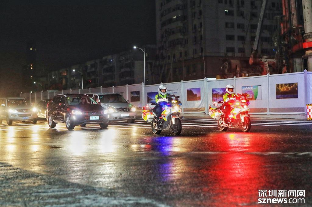 在深圳交警鐵騎帶領(lǐng)下,社會(huì)車輛有序通過黃木崗十字路口