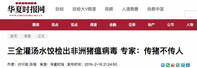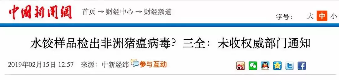 據(jù)紅星新聞報道,多家媒體稱,2月9日,湖南省湘西自治州重大動物疫病防制指揮部辦公室接到省防治重大動物疫病指揮部辦公室通知,要求瀘溪縣重大動物疫病防制指揮部辦公室對來源于吉首市凌云冷凍食品批發(fā)部凍庫的產(chǎn)品進行抽樣,在瀘溪縣好又多和萬家福兩家超市共抽取4個批次12份樣品,經(jīng)州動物疫病預防控制中心檢測,其中由河南三全食品有限公司生產(chǎn)批次為20190113H的“三全灌湯水餃”3份樣品為非洲豬瘟病毒核酸陽性。