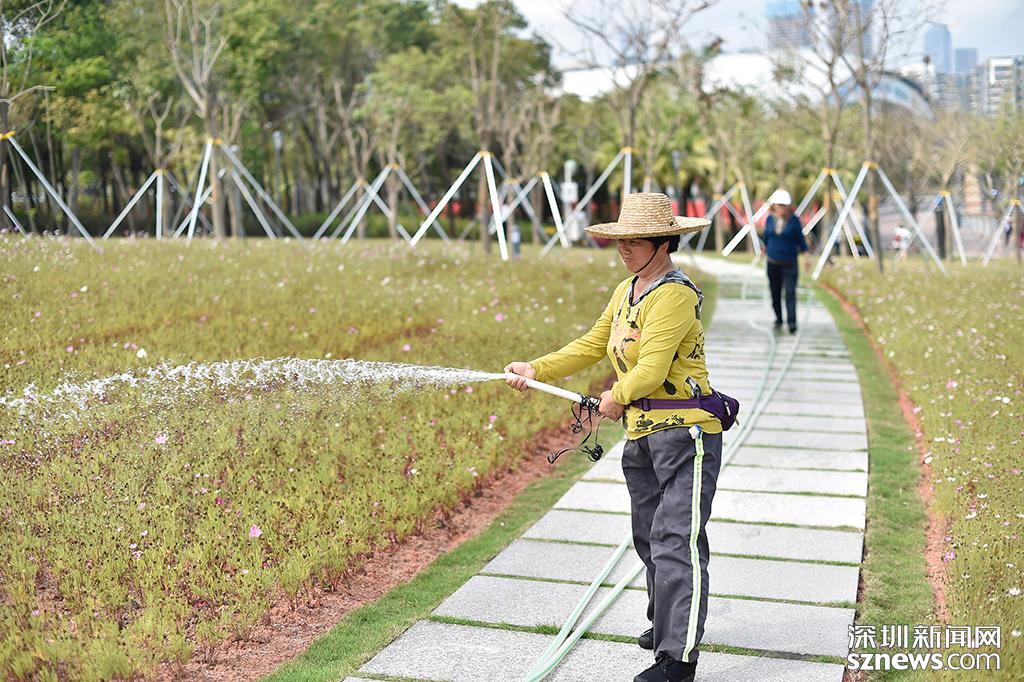 流花山的園林工作人員正在給花朵澆水,保證強太陽下花朵有充足水分