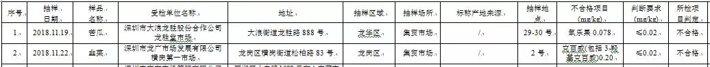 此次監(jiān)測(cè)蔬菜63品份,其中2份樣品農(nóng)殘超標(biāo),不合格樣品抽樣位點(diǎn)是:龍華區(qū)大浪街道龍勝路888號(hào)龍勝堂市場(chǎng)29-30號(hào)檔和龍崗區(qū)橫崗街道橫崗第一市場(chǎng)2號(hào)檔。