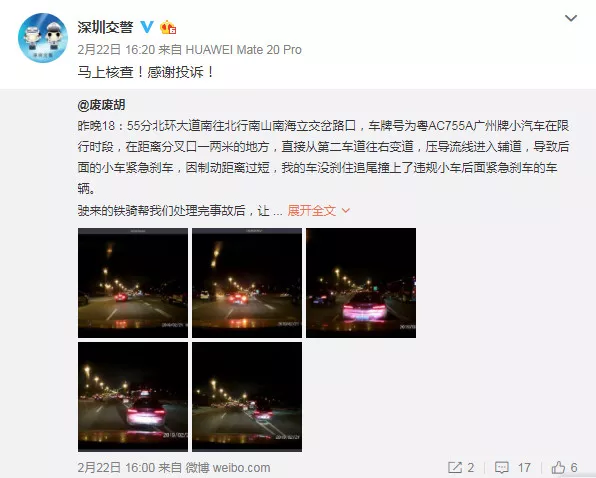 深圳新聞網(wǎng)2019年2月26日訊(記者 劉婷)據(jù)深圳交警權(quán)威發(fā)布消息,2019年2月22日下午16時22分,深圳交警收到微博網(wǎng)友舉報稱:2月21日18時55分,在北環(huán)大道南海立交路段,一輛廣州牌照小車在深圳限行時段,連續(xù)變道并壓導(dǎo)流線進入輔道,導(dǎo)致后面兩車發(fā)生追尾事故。深圳交警立即對舉報信息進行分析、經(jīng)過后臺系統(tǒng)查詢,與被舉報廣州車牌小車車主取得聯(lián)系,但車主稱不是其本人開車,而且人和車都在廣州,不方便來深圳處理。