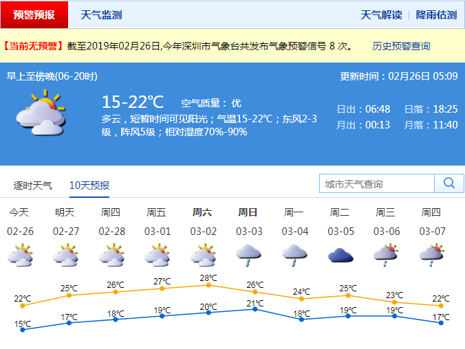 市氣象局預計,27日-3月2日多云間陰天,可見陽光,早晚有輕霧或霧,天氣溫暖濕潤;3月3-4日有分散小雨,氣溫略降。3月深圳市天氣偏暖,空氣潮濕,雨霧等低能見度天氣易發(fā),仍有3-4次弱冷空氣影響,強度比本次冷空氣弱,但冷空氣活動時氣溫都會比前日略降,并轉陰雨天氣。