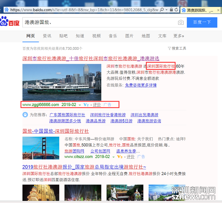 深圳市消委會模擬消費者網絡搜索實際使用場景,在百度搜索中搜索“港澳游國旅”等關鍵詞,進行了專項測試調查。調查發(fā)現,搜素“港澳游國旅”等關鍵詞時搜索頁面會出現加V等級認證的旅行社廣告信息,但經核實,“深圳信用網”商事主體登記信息中并無該企業(yè)。