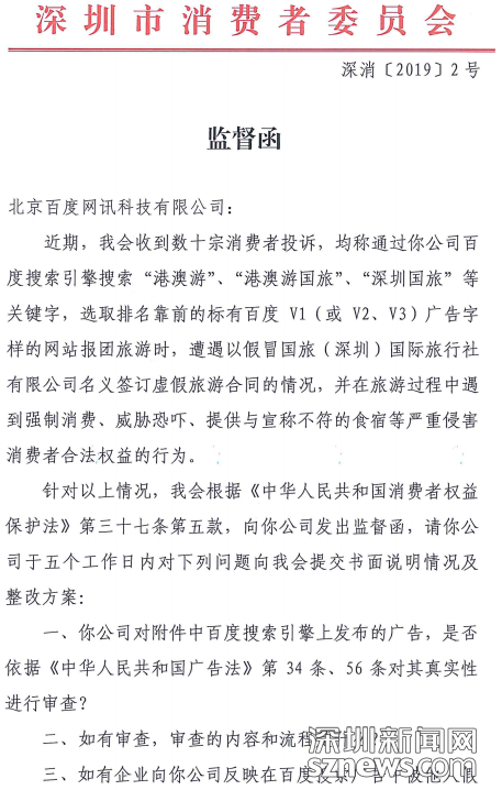2月26日上午,深圳市消費者委員會(以下簡稱“深圳市消委會”)就春節(jié)期間,不少外地消費者通過百度搜索廣告報名港澳游“野馬”旅行社上當被騙的問題,召開港澳游“野馬”旅行社投訴調查情況通報會,通報投訴調查進展情況。