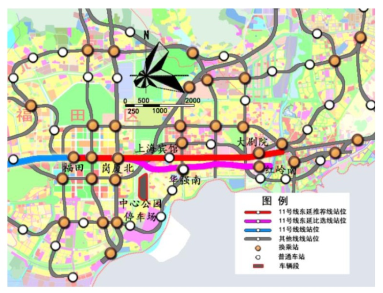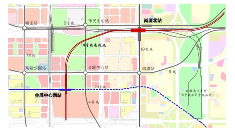 14號線南延與規(guī)劃20號線換乘,可以緩解崗廈北站客流壓力。優(yōu)化網(wǎng)絡(luò)布局,減少單點換乘產(chǎn)生的客流風(fēng)險,增加對福田中心區(qū)的網(wǎng)絡(luò)覆蓋。