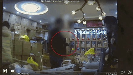 秦女士告訴記者,其實(shí)此時錢已經(jīng)被掉包了。從監(jiān)控視頻中可以發(fā)現(xiàn),這位顧客在秦女士去冰柜拿茶葉,小娟在檢查第一張100元時,疑似從外套里拿出了一張假幣壓在了錢包底下。
