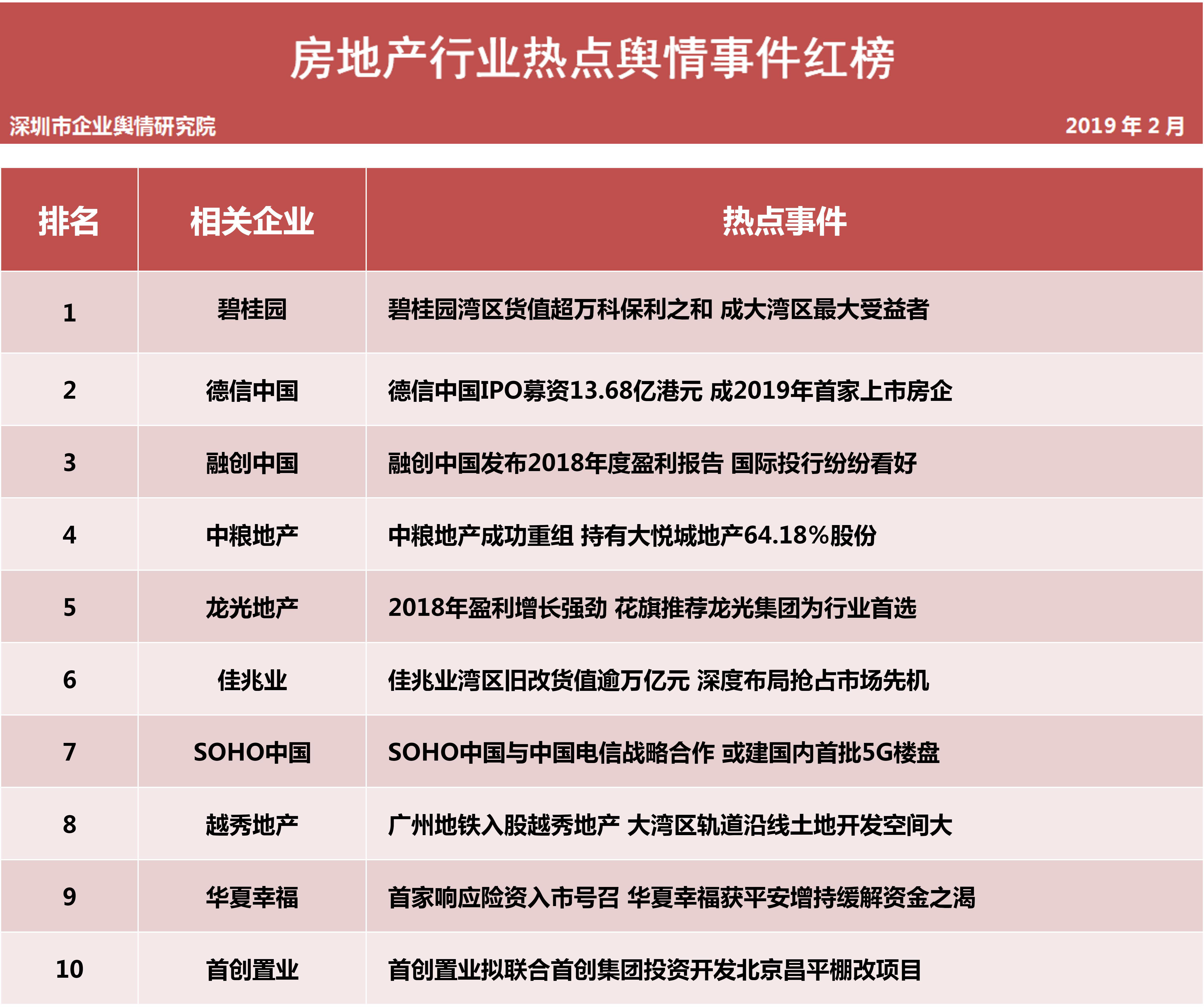 深圳新聞網(wǎng)2019年3月5日訊 (記者田志強(qiáng) 通訊員陳文光)3月5日,深圳企業(yè)輿情研究院發(fā)布第十三批企業(yè)輿情榜單。本次榜單重點(diǎn)聚焦房地產(chǎn)及醫(yī)藥保健兩個行業(yè)。房地產(chǎn)行業(yè)企業(yè)輿情榜單由房地產(chǎn)行業(yè)熱點(diǎn)輿情事件排行榜(紅、黑榜)及房地產(chǎn)企業(yè)公眾形象排行榜組成。